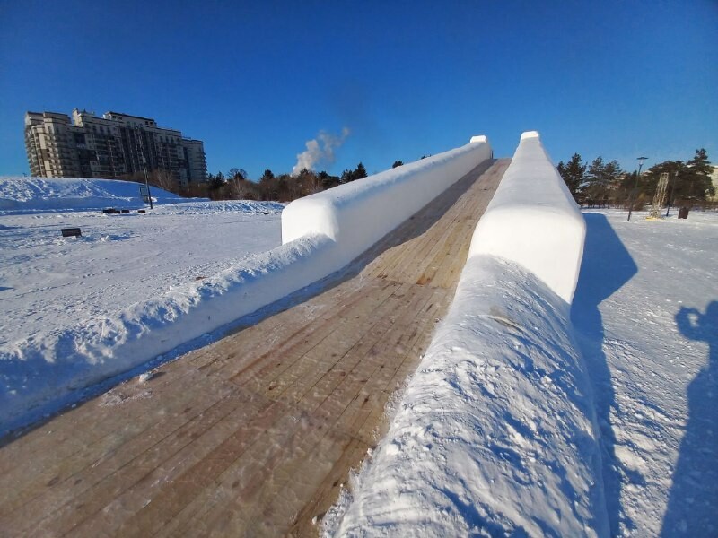 По словам Виталия Осьмушкина, его компания изготовила 10 горок в Благовещенске (на площади Ленина, на набережной реки Зеи и в других районах города), снежно-ледовый каток на площади и ледовую композицию на улице Заводская, 2.
