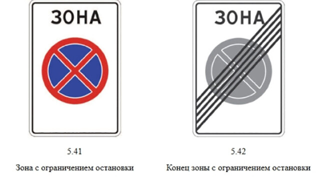5.41 «Зона с ограничением остановки» и 5.42 «Конец зоны с ограничением остановки» — раньше на дорогах уже встречались знаки, обозначающие начало и конец зоны с запретом стоянки. Теперь появятся аналогичные знаки, касающиеся остановки. Между ними запрещаются и остановка, и стоянка транспортных средств. Подробнее здесь.