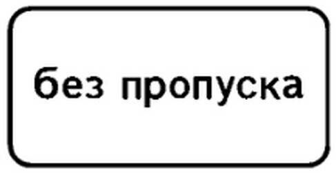 8.27 «Без пропуска» — применяется совместно с определенными запрещающими знаками 3.1 — 3.4, 3.11, 3.12, 3.34. Информирует водителей о том, что, несмотря на действие указанного запрещающего знака, дальнейшее движение или стоянка / остановка разрешены исключительно для транспортных средств, имеющих спецпропуск.