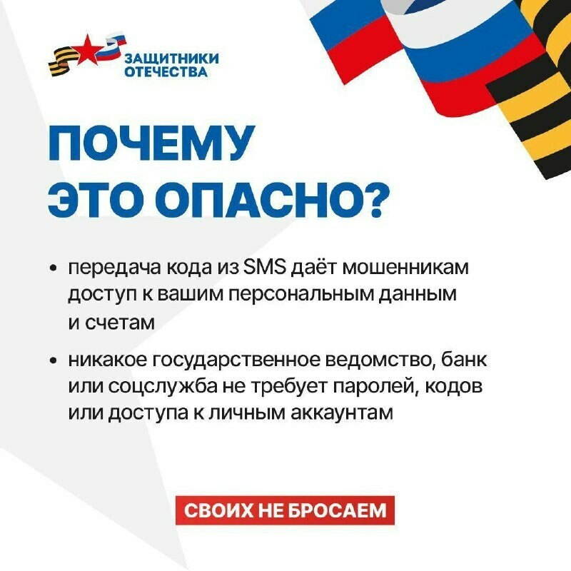«Внимание! В разговоре могут представиться сотрудниками фонда «Защитники Отечества», в том числе социальными координаторами. От их имени аферисты просят персональные данные и код из СМС», - сообщили в амурском фонде.