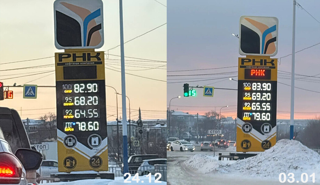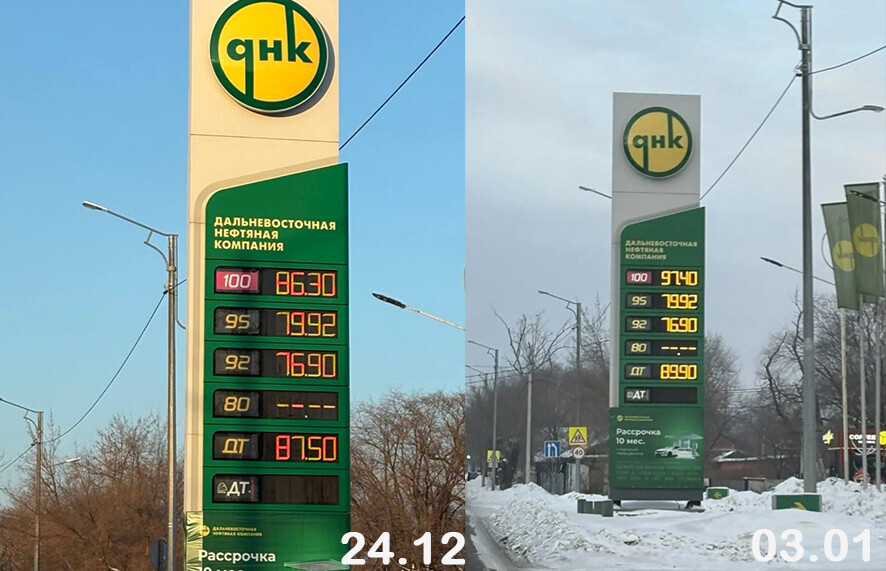 В сети ННК цены выросли на все виды топлива. Так, АИ-101 подорожал на 1 рубль 70 копеек и литр теперь стоит 102 рубля 70 копеек. АИ-95 подорожал на 1 рубль 27 копеек. Вместо 70 рублей 31 копейки придется теперь отдавать 71 рубль 58 копеек. АИ-92 подорожал на 1 рубль 11 копеек. Если в декабре за литр благовещенцы платили 66 рублей 65 копеек, то уже в январе отдают 67 рублей 76 копеек. Улучшенный дизель подорожал на 2,3 рубля и за литр придется отдавать 85 рублей 97 копеек вместо 83,67 рубля. Обычный дизель вырос в цене на 2 рубля 28 копеек и литр стоит 84 рубля 52 копейки. В декабре же литр этого топлива обходился горожанам в 82 рубля 24 копейки.