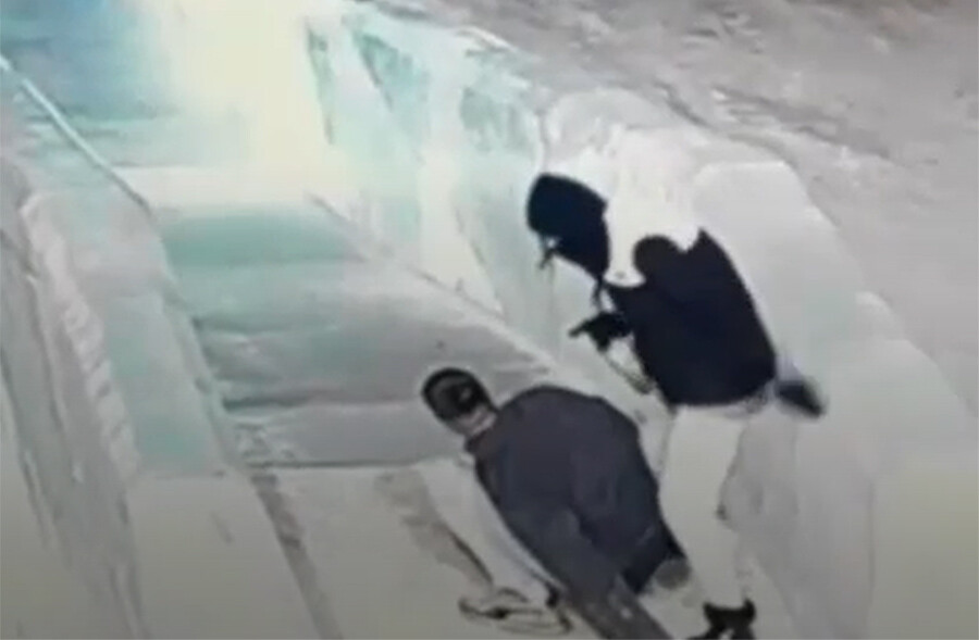 В 03:26 молодой человек с девушкой решили к уже выпитому добавить еще адреналин. Пара поднялась на ледяную горку. Девушка сначала столкнула друга, а потом бросила бутылку, которую держала в руках и которая, конечно, разбилась.