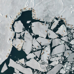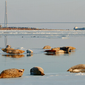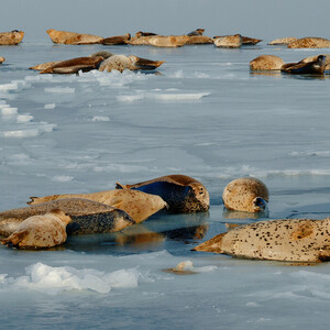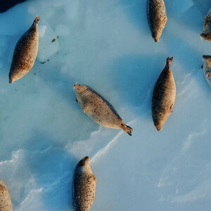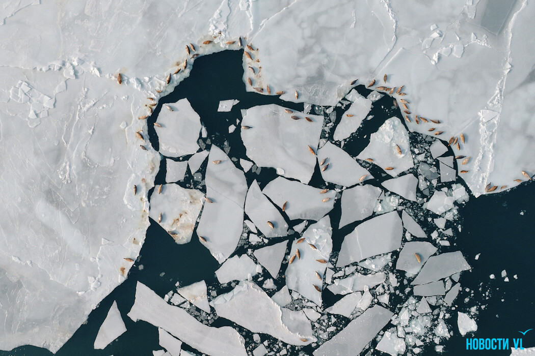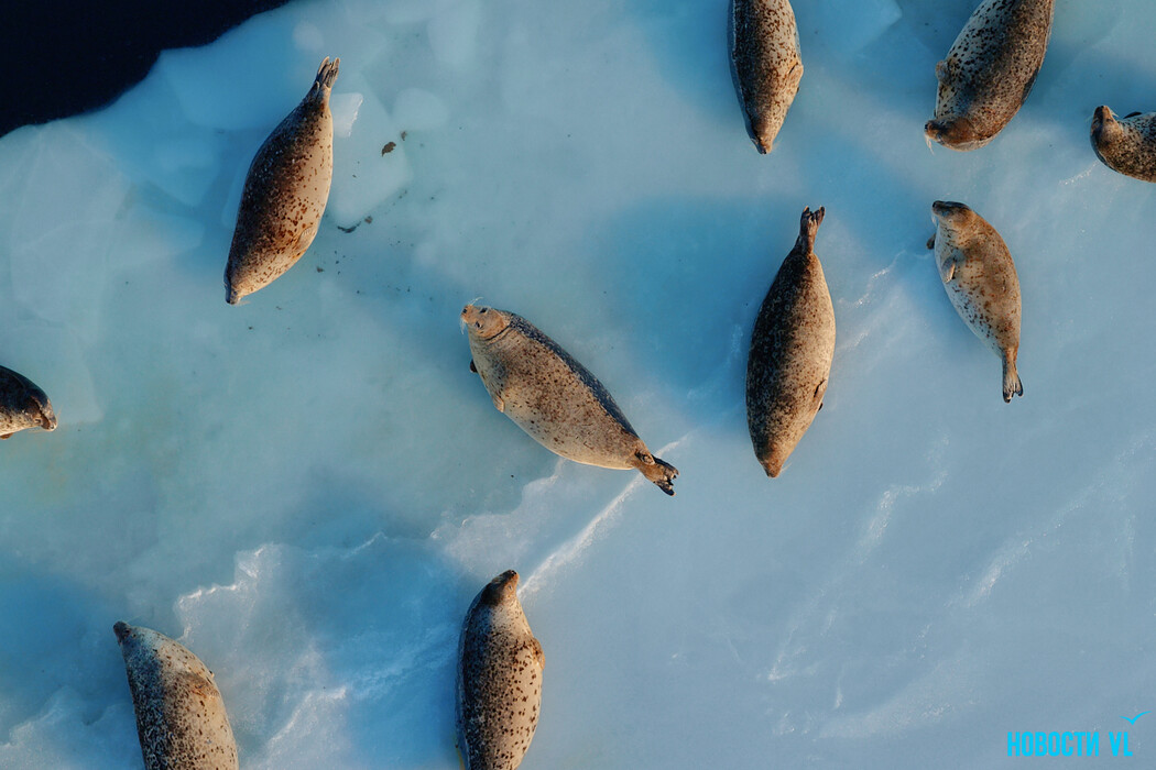 В конце декабря тюлени приплывали к Токаревскому маяку, чтобы полакомиться рыбой. Теперь же они отдыхают на льдинах. Ларги выбрались из воды, расположившись вдоль ледяной кромки. Кажется, что животные улеглись одной большой плотной группой, но на самом деле это не так. Многие лежат почти в обнимку со своими детёнышами поодаль от остальных, другие следуют правилам иерархии своего вида и держатся дальше от моря.