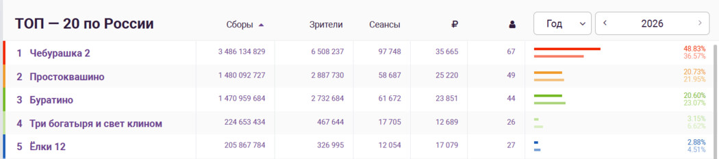 Вторая часть «Чебурашки» вышла в прокат 1 января. По состоянию на 18:46 мск 6 января, картина заработала 3,4 миллиарда рублей. Прошлогодний лидер проката, вторая часть «Волшебника Изумрудного города», заработал 3,3 миллиарда рублей за год.