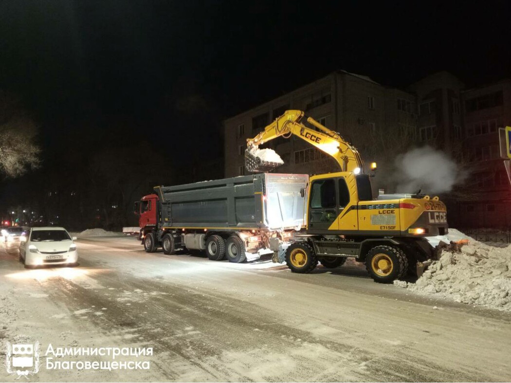В Благовещенске продолжается расчистка городских магистралей от снега и наледи. Всего же с начала года с улиц вывезли около двух тысяч тонн снега. Очищают преимущественно прилотковые части дорог, парковки.