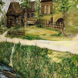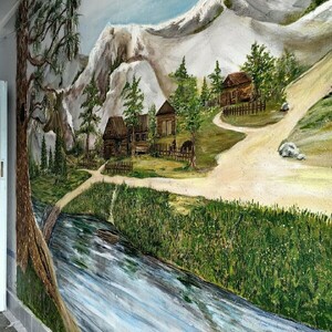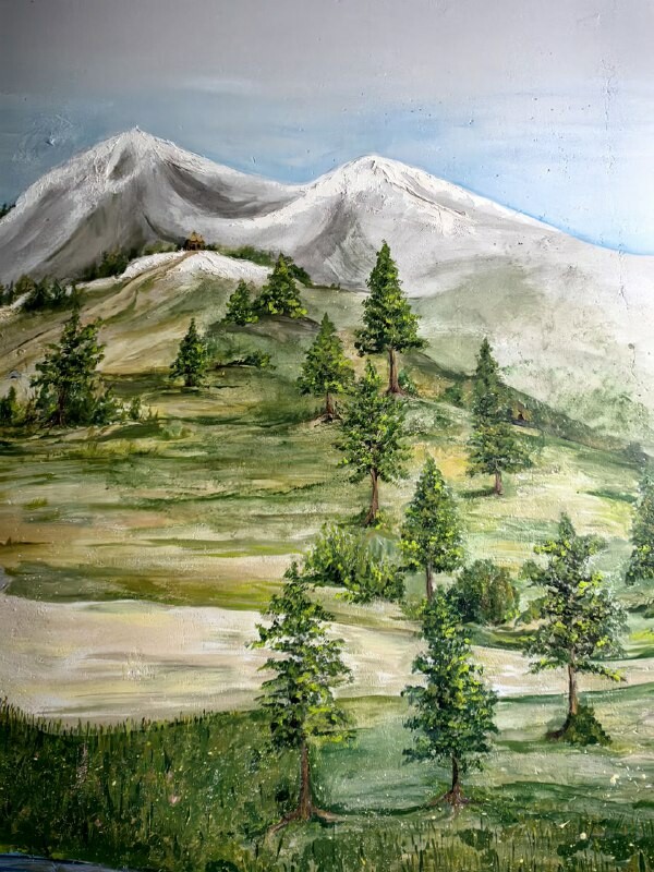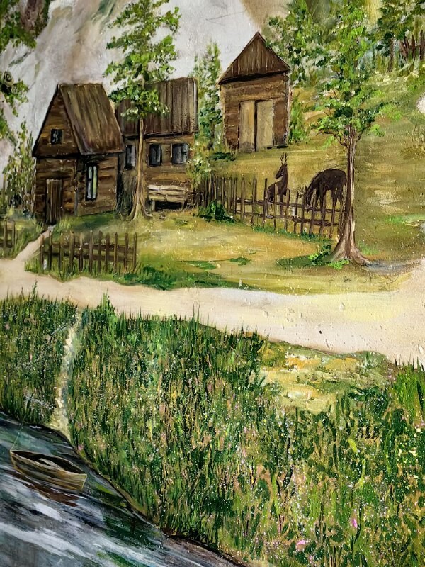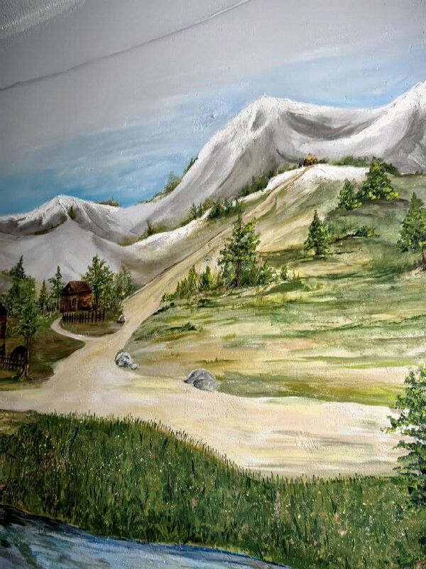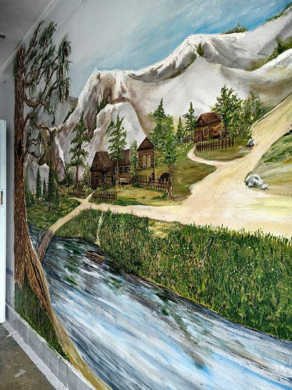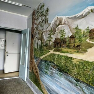 На стенах подъезда – северные пейзажи, домики на берегу реки и пасущиеся олени.
