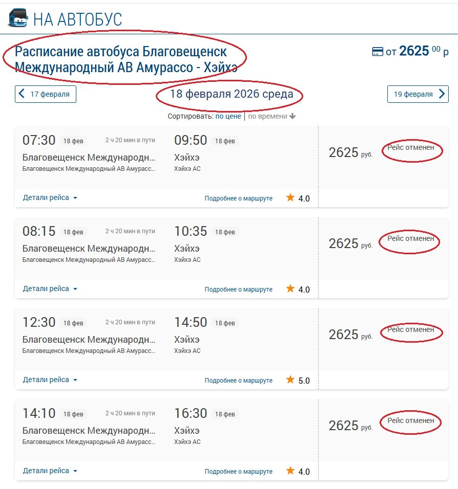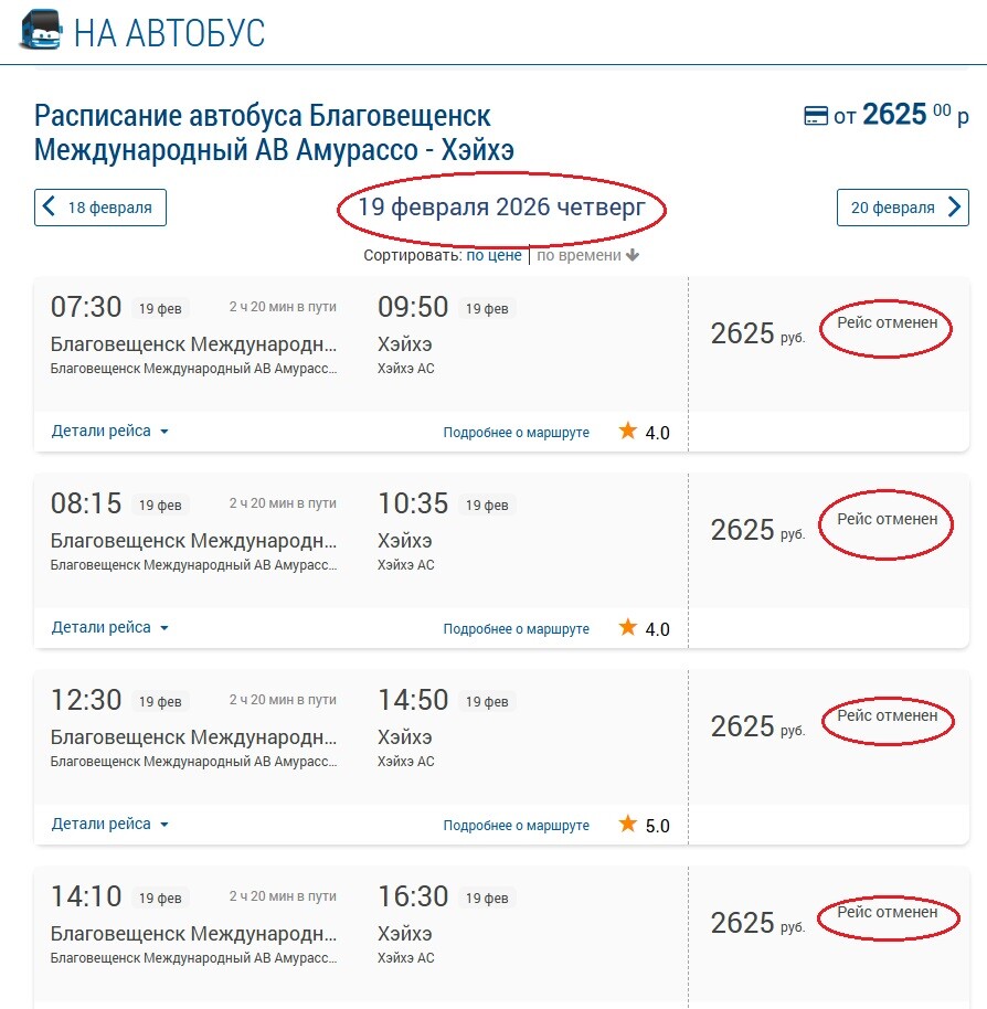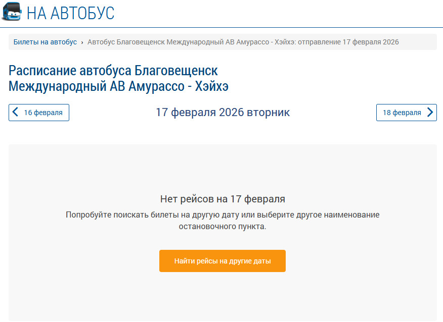 На сервисе по продаже билетов на автобус, соединяющий российский и китайский города, указано, что 17 февраля рейсов из Благовещенска в Хэйхэ нет вообще, а 18 и 19 февраля они были отменены.