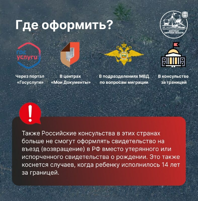 Для поездок в Абхазию, Беларусь, Южную Осетию, Казахстан и Киргизию теперь обязательно потребуется загранпаспорт ребенка, предупреждают в амурском минтрансе. Важный нюанс: дети, которые уже выехали по свидетельству о рождении до 20 января, смогут вернуться в Россию по этому же документу.