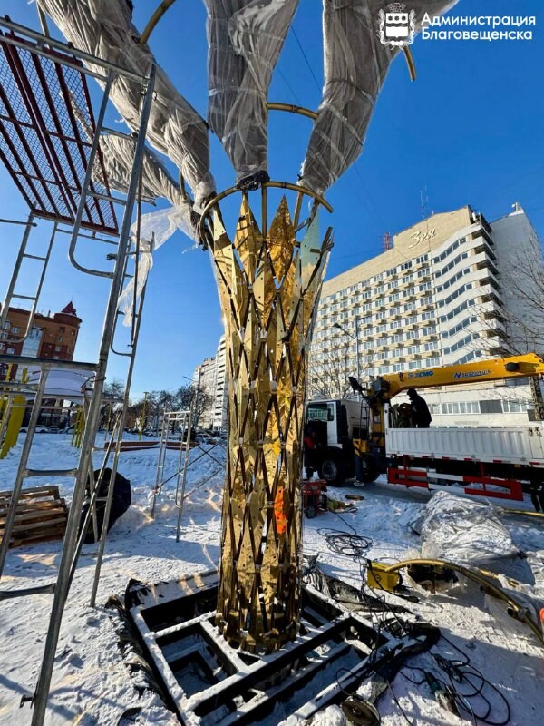В Благовещенске появится новый арт-объект – золотое дерево. Рабочие начали монтаж конструкции, сообщает администрация города.