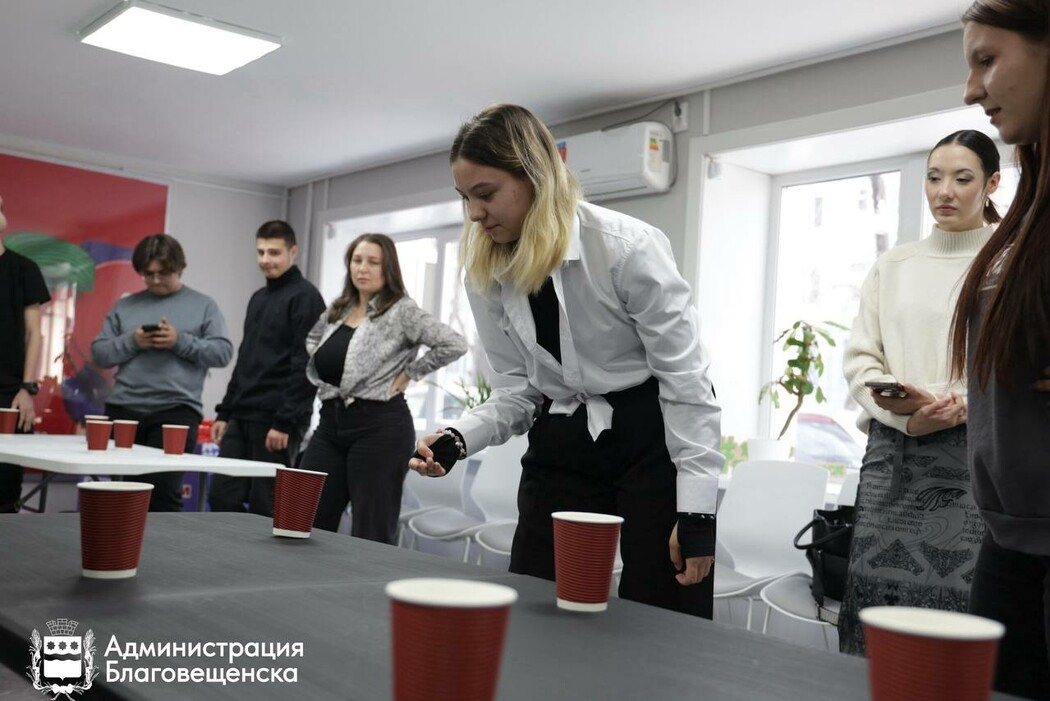 Участники турнира по тусологии справлялись с неожиданными заданиями: строили башни из пластиковых стаканчиков на скорость, старались перенести конфеты, аккуратно раскручивая их в бокале. Испытания проверяли не только ловкость и реакцию, но и учили договариваться, поддерживать товарищей по команде и не терять чувство юмора.