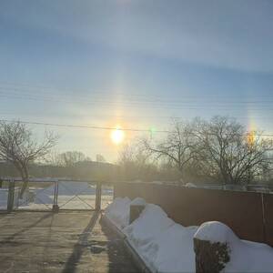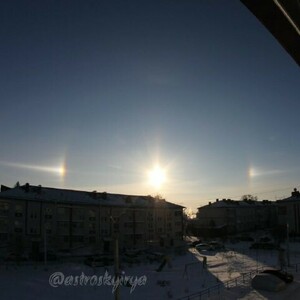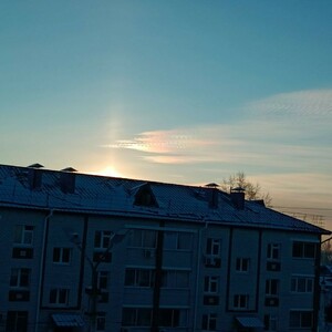 Паргелий – это «ложное солнце», которое относится к атмосферным оптическим явлениям. Это светлое радужное пятно, возникающее по одну или обе стороны от настоящего Солнца. Оно образуется при преломлении солнечного света в шестигранных ледяных кристаллах, парящих в перистых облаках (обычно зимой или в морозы), и часто наблюдается, когда солнце находится низко над горизонтом.