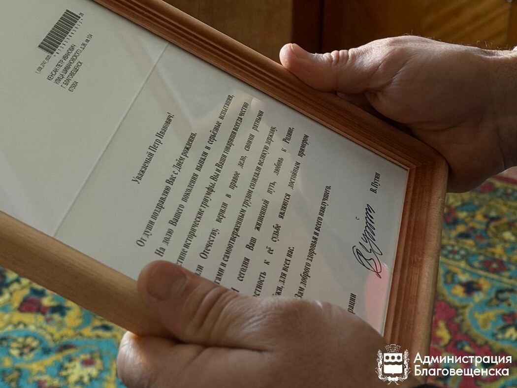 Градоначальник передал Петру Кенсану поздравления и наилучшие пожелания от президента России Владимира Путина, губернатора Амурской области Василия Орлова, а также от всех жителей Благовещенска, сообщает мэрия.