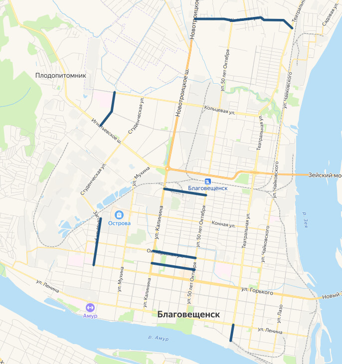 В прошлом году благодаря нацпроекту «Инфраструктура для жизни» в Благовещенске отремонтировали дороги на 18 кварталах. Проезжую часть и коммунальные сети обновили на Горького от Калинина до Больничной, Октябрьской от 50-летия Октября до Театральной, Амурской от Театральной до Кузнечной и от Политехнической и Чайковского, Ленина от Пушкина до Первомайской, 50-летия Октября от Амурской до Ленина, Мухина от железнодорожного переезда до Пролетарской.