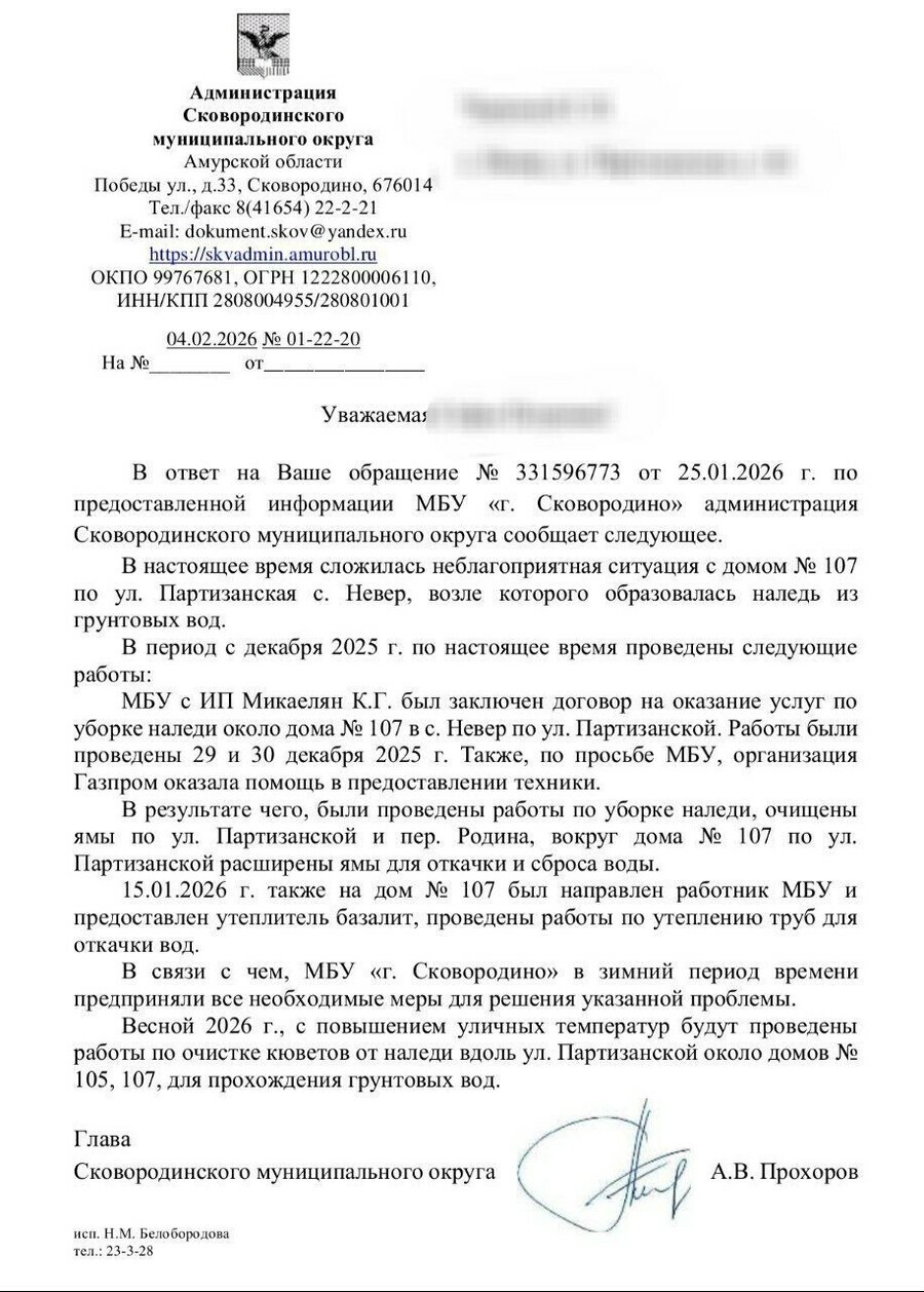 Администрация Сковородинского муниципального округа Амурской области в ответ на запрос владельцев дома сообщила, что сложилась неблагоприятная ситуация с домом No 107 по улице Партизанской в селе Невер, возле которого образовалась наледь из грунтовых вод.