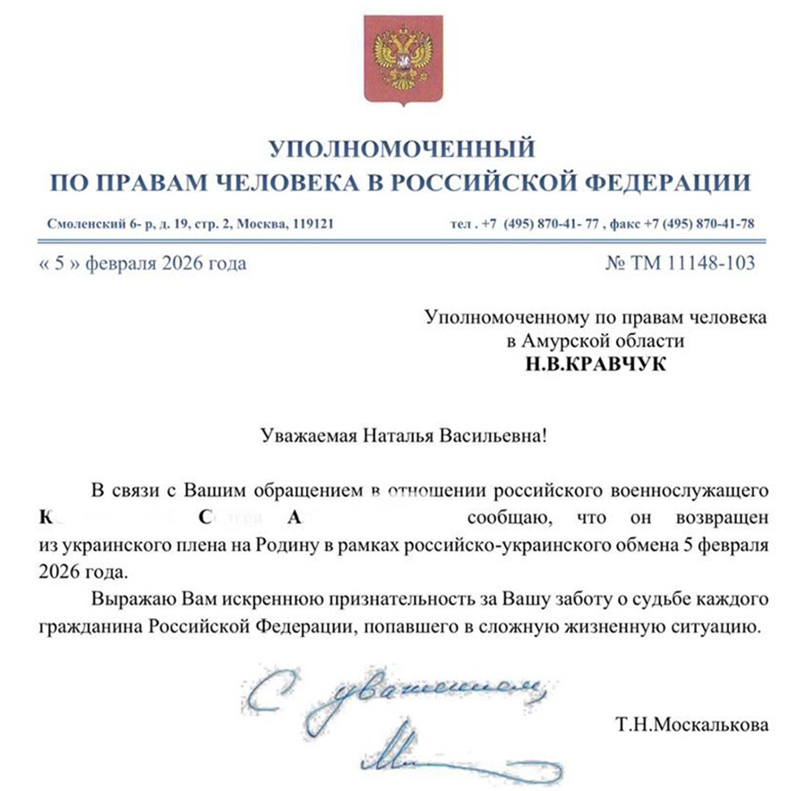 Амурчанин в числе других россиян вернулся из плена в Россию. Об этом сообщила амурскому омбудсмену Наталье Кравчук уполномоченный по правам человека в Российской Федерации Татьяна Москалькова и выразила ей глубокую благодарность за работу.