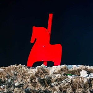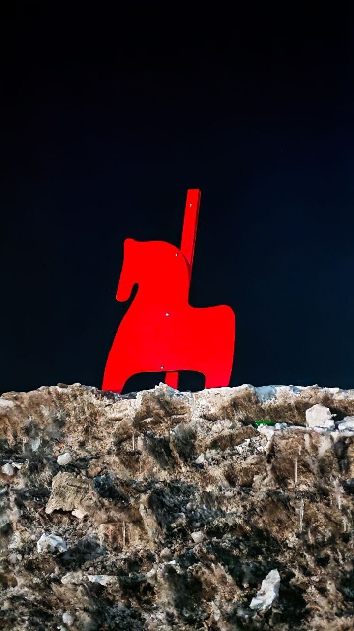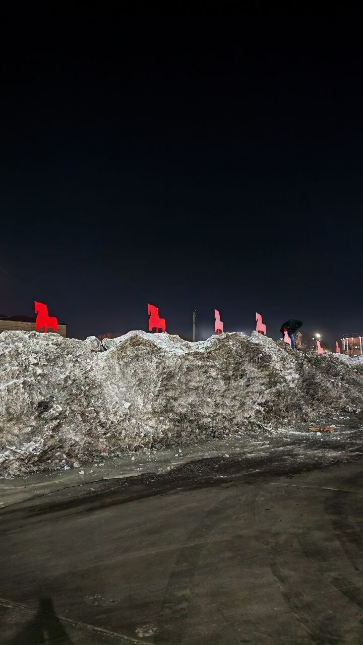 Творческая группа города-галереи «Сигналы» решила нестандартно поздравить жителей Поднебесной с Праздником весны. На масштабном арт-объекте «Великая белая стена» размещен табун из восьми огненных красных лошадей, которых установили на навалах снега у края парковки.