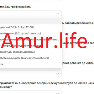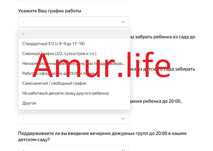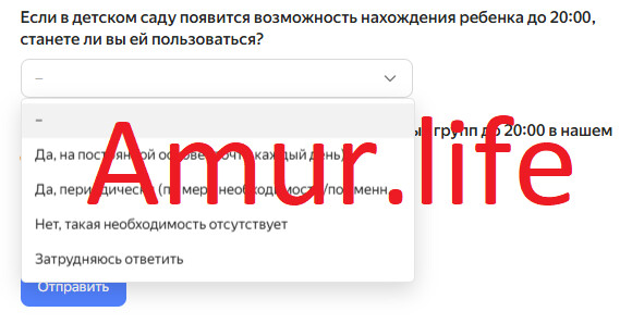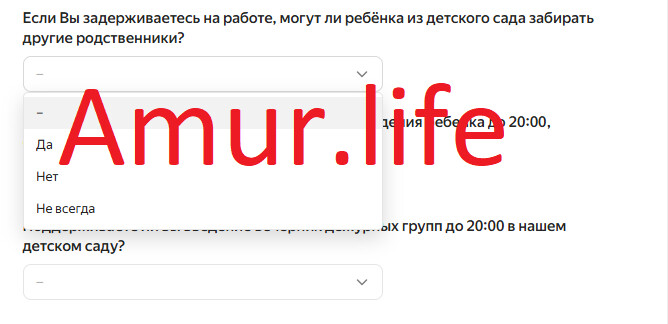 В амурской столице для родителей детей, посещающих детские сады, организовали анонимный опрос. В специальной форме их просят ответить на несколько вопросов, касающихся рабочего графика и необходимости оставлять своих малышей в дошкольном учреждении до 20:00.