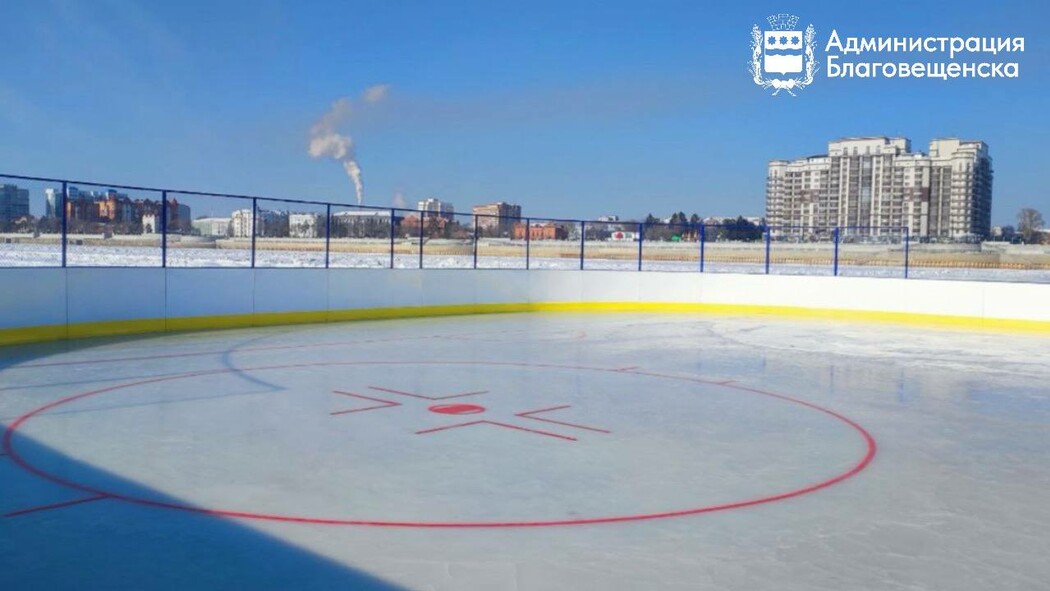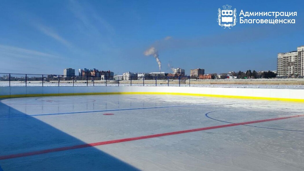На льду Амура уже установлена хоккейная коробка. Сотрудники спорткомплекса «Юность» 12 февраля начали наносить разметку.