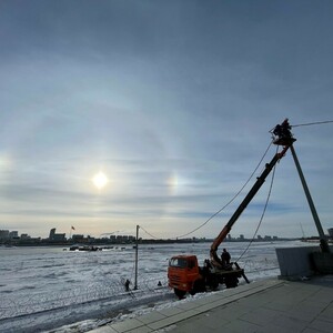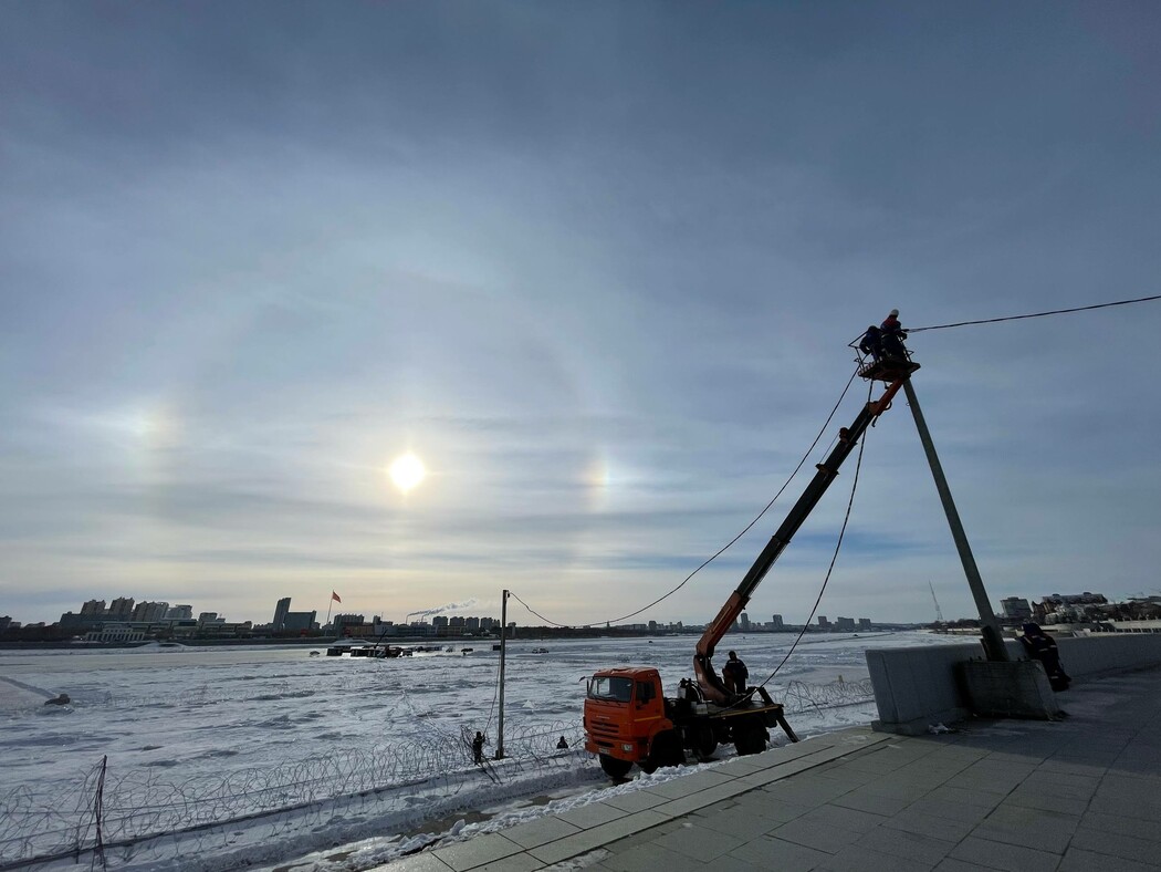 Электрический кабель не было возможности уложить в грунт, поэтому специалисты главного ресурсоснабжающего предприятия Благовещенска установили временные опоры на пограничный лед и протянули сети, сообщает РКС Благовещенск.