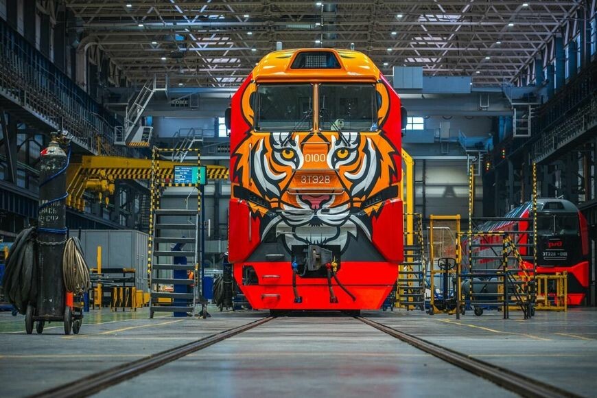 На Брянском машиностроительном заводе прошла торжественная презентация магистральных грузовых тепловозов с юбилейными номерами. Один из них, 3ТЭ28–100, в ливрее, имитирующей окрас амурского тигра, будет работать в депо города Тында Дальневосточной железной дороги.