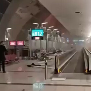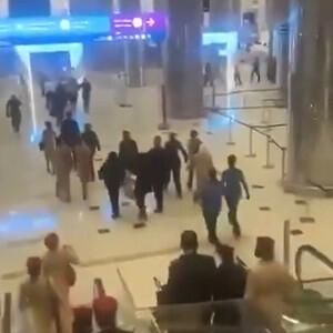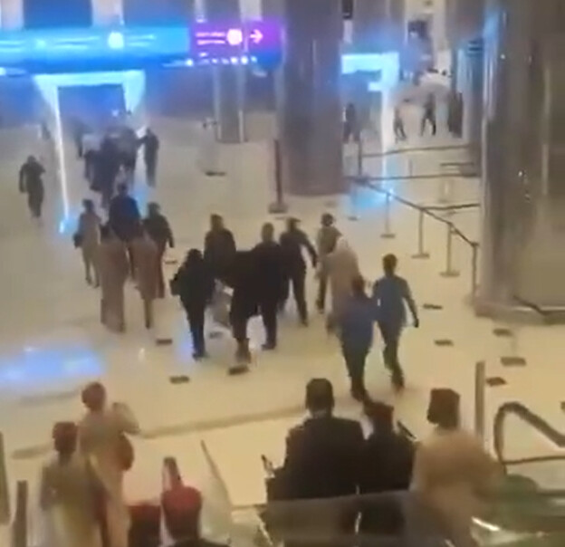 Сотни пассажиров в спешке бегут к выходам из аэропорта Дубая. Некоторые бросают чемоданы прямо в залах. Частично повреждён фасад здания, на полу валяются стёкла и обломки панелей. Персонал поднимает тревогу и уводит людей в укрытие. Пассажиры двигаются колоннами, без остановок.