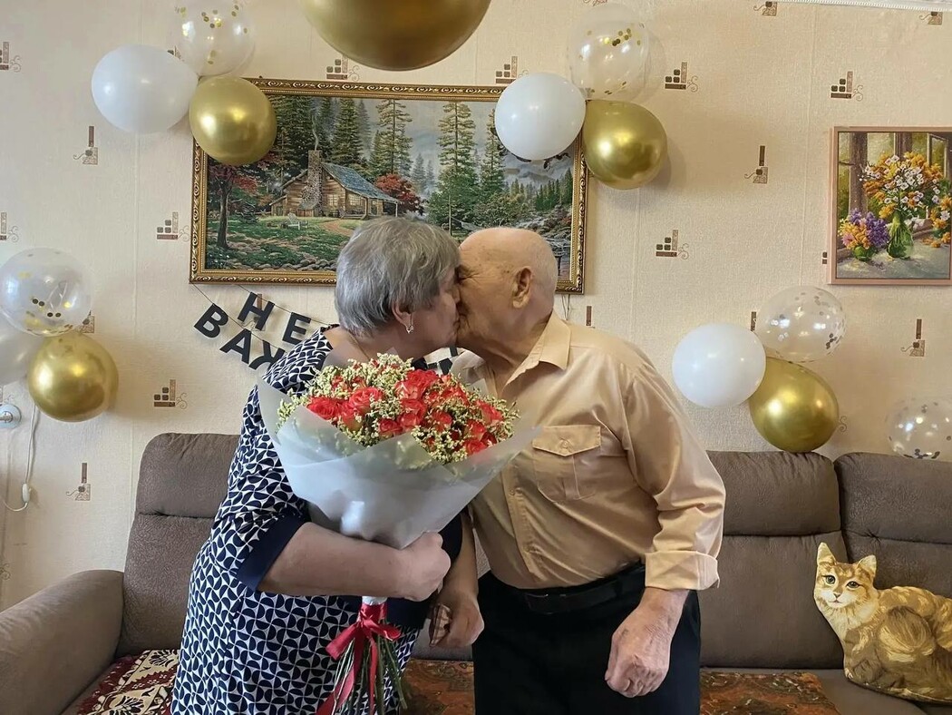 В Свободном супруги Юрий Ильич и Людмила Ивановна Беляевы отметили бриллиантовую свадьбу — 60 лет совместной жизни. Они были отмечены поздравительными письмами от администрации города и скрепили узы крепким поцелуем.
