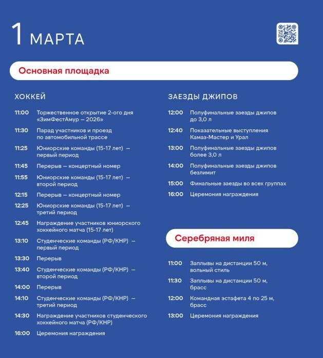 В Благовещенске на льду реки Амур 1 марта пройдет второй соревновательный день международного фестиваля зимних видов спорта #ЗимФестАмур. Пройдут показательные выступления грузовых команд, заезды джипов, хоккей и соревнования по зимнему плаванию, а откроет программу выступление известной российской фигуристки Евгении Медведевой.