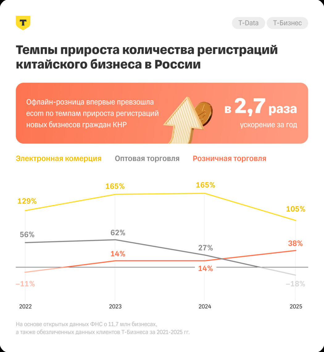 Однако тенденции меняются. В 2023 году китайские предприниматели в основном выходили в оптовую торговлю, в 2024 году электронная коммерция впервые обогнала опт по числу новых регистраций. В 2025 году на российском рынке сформировался новый тренд: офлайн-розничная торговля впервые превзошла ecom по темпам прироста регистраций новых бизнесов граждан КНР, ускорившись за год в 2,7 раза — с 14 % до 38 %. В онлайн-сегменте, напротив, динамика замедлилась в 1,6 раза по сравнению с 2024 годом (с 166 % до 105 %). Количество регистраций граждан КНР в оптовой торговле в 2025 году и вовсе сократилось на 18 %.