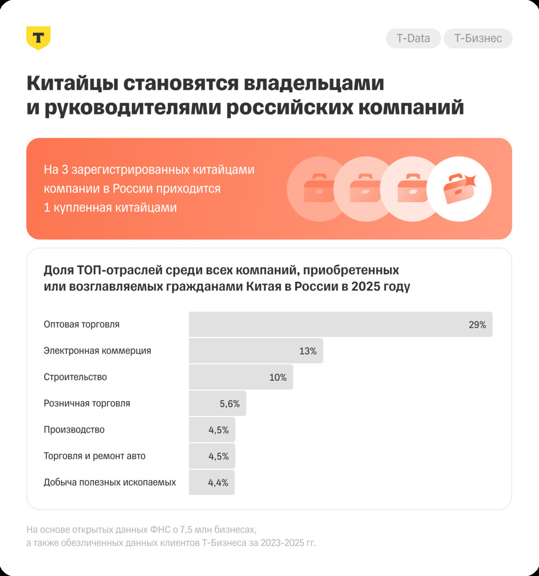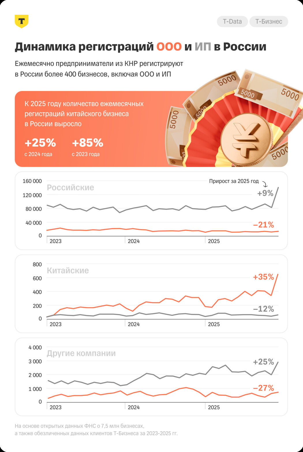 T-Бизнес в рамках аналитического проекта T-Data изучил динамику российских компаний и ИП, которыми владеют и управляют граждане Китая. К этой категории отнесены компании, где генеральный директор или учредитель – гражданин Китая. В исследовании рассмотрены регистрации таких компаний в России за 2023–2025 годы, а также определены популярные отрасли и регионы работы китайских компаний. Анализ основан на открытых данных ФНС о 7,5 миллиона действующих и закрытых бизнесах, а также обезличенных данных клиентов Т-Бизнеса.