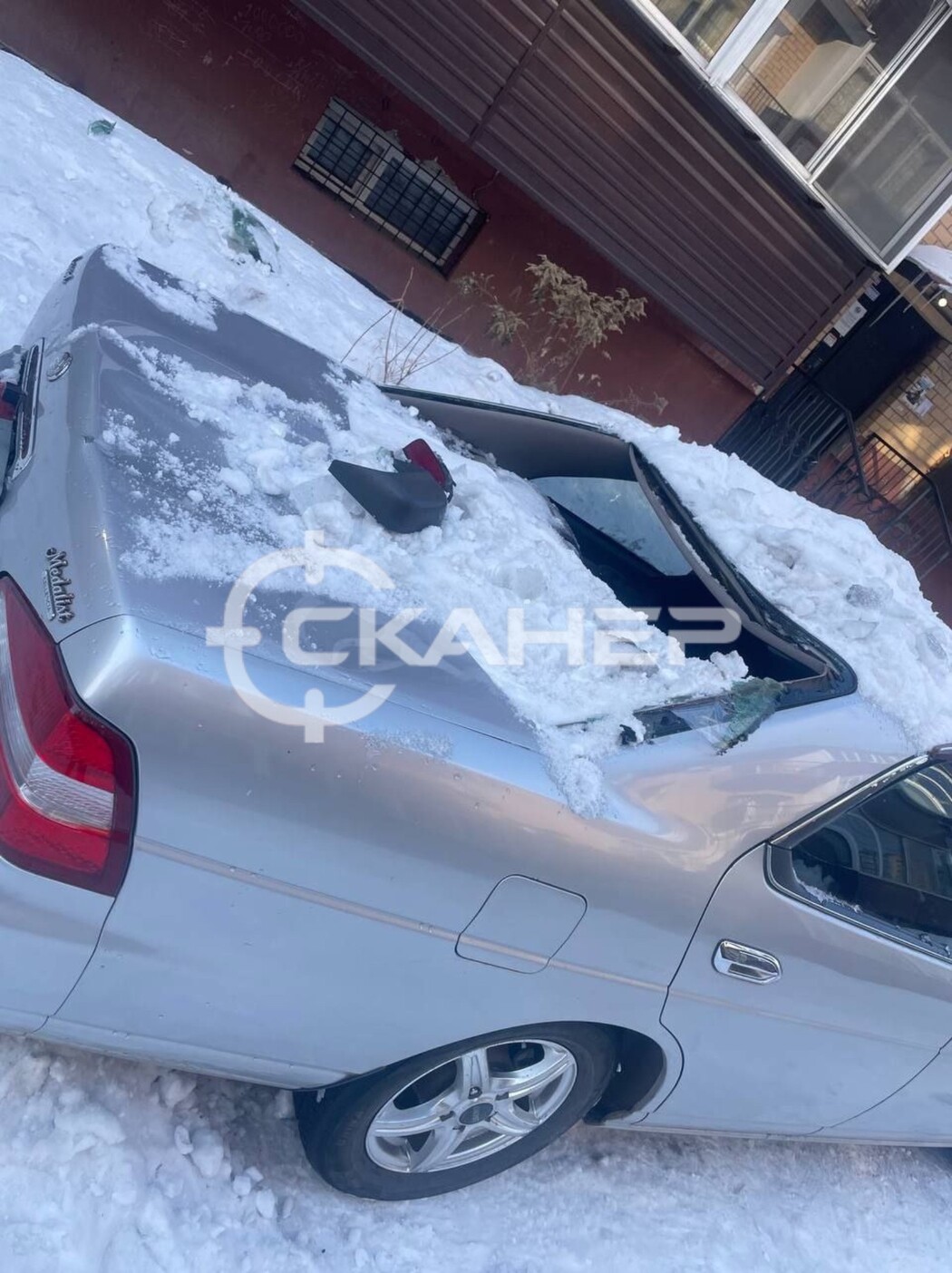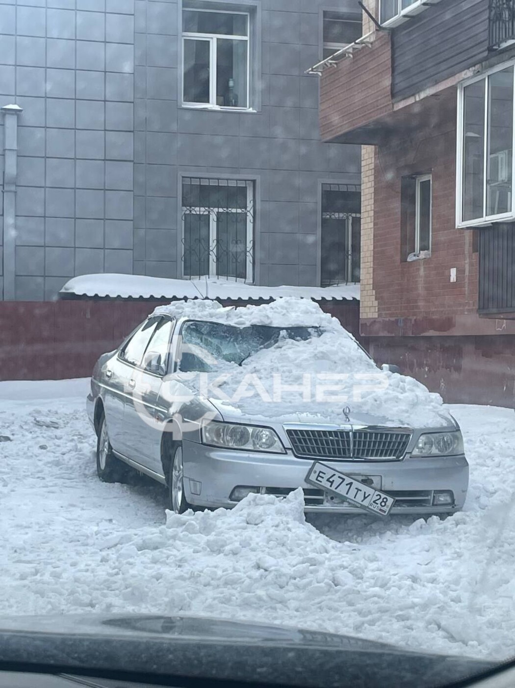 «В Благовещенске во дворе дома на Театральной снег сошел с крыши на припаркованный рядом Nissan Laurel. В итоге автомобилю расплющило крышу и повыбивало стекла», – поделился Skaner28 в МАХ.