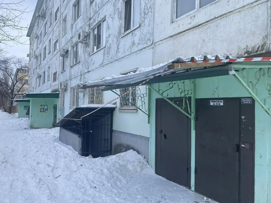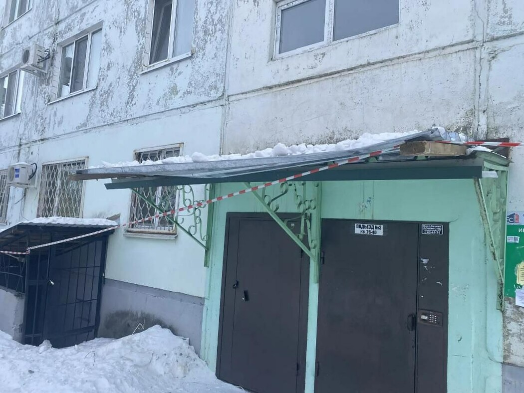На фото, которые благовещенцы прислали в редакцию, видно, что территорию огородили лишь сигнальной лентой. Других конструкций, защищающих пешеходов от падения с крыши предметов, на территории нет. Также на одном из кадров видно, как на краю крыши лежат деревянные балки. Они висят прямо над подъездом.