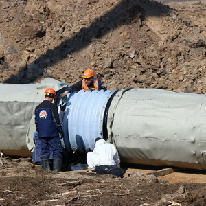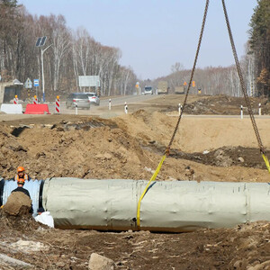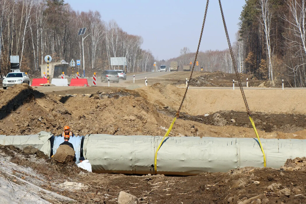 На аэропортовской трассе приступили к монтажу водопропускных труб. Они необходимы для пропуска и отвода от полотна воды, чтобы трасса не разрушалась от дождей.