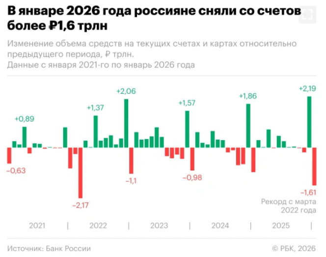 При этом в январе 2026 года они поставили рекорд по обналичиванию и сняли 1,6 триллиона рублей. Перед этим на счетах у них был декабрьский приток в 3,6 триллиона рублей, когда россияне получают премии и тринадцатые зарплаты.