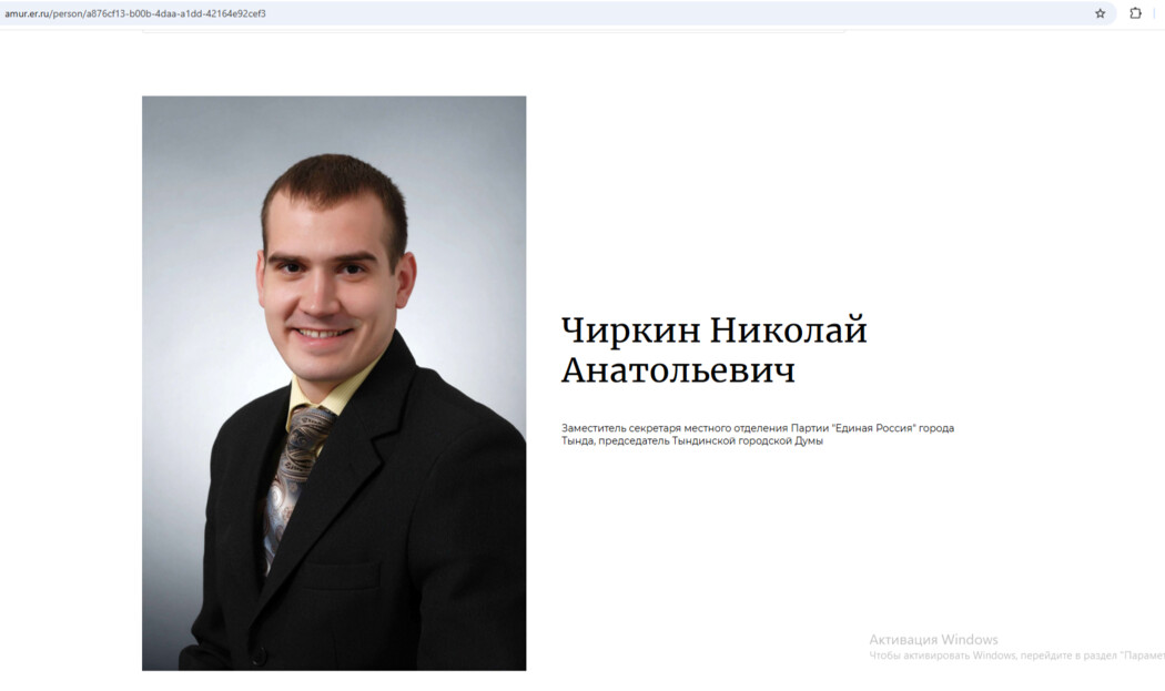 На сайте регионального отделения «Единой России» также указано, что Николай Чиркин является заместителем секретаря местного отделения партии «Единая Россия» города Тында.