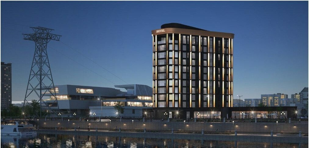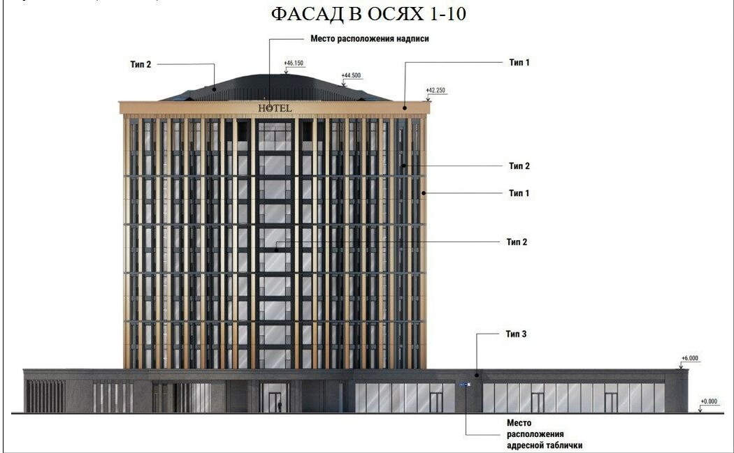 Для отделки фасадов будут использованы декоративные алюминиевые композитные панели, искусственный камень и тонкостенная штукатурка – все в цвете золота и темного графита. Как и в первых двух случаях, предусмотрена подсветка здания. Участок земли, на котором запланировано строительство, имеет вид разрешенного использования - гостиничное обслуживание.