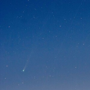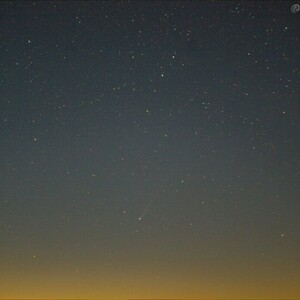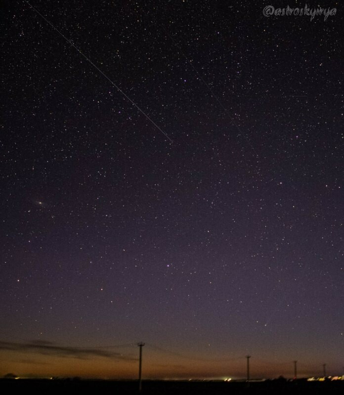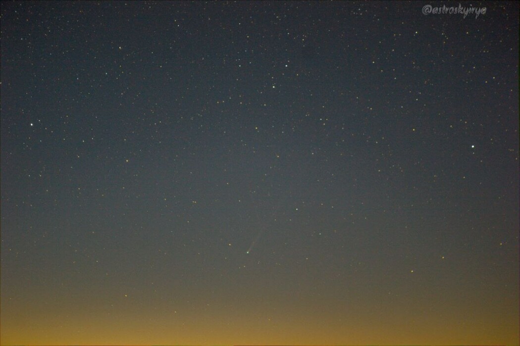 По словам автора – астронома-любителя Ирины Пархомовой – долгое время наблюдениям мешали погодные условия и яркий лунный свет. Удачный момент представился лишь под конец видимости кометы – съемка велась на рассвете.