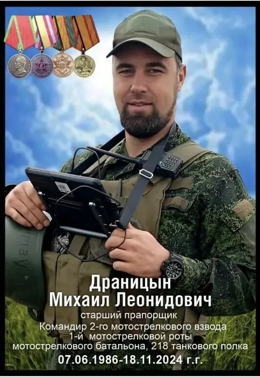 17 ноября 2024 года в ходе выполнения боевой задачи в одном из населенных пунктов Донецкой Народной Республики Драницын погиб, действуя в составе штурмовой группы, рассказал у себя в соцсетях мэр Благовещенска Олег Имамеев.