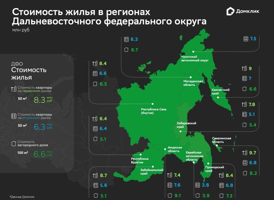 Стоимость недвижимости в регионах Дальневосточного федерального округа: квартиры на первичном и вторичном рынках (площадью 50 кв.м.) и загородные дома (площадью 100 кв.м.). Дополнительно приведены данные по всему округу в целом («ДФО»). На карте не приведена стоимость новостроек в Еврейской автономной области, Магаданской области и Чукотском автономном округе, а также стоимость загородных домов в Чукотском АО из-за отсутствия предложения. Данные витрины Домклик на август 2024 года.