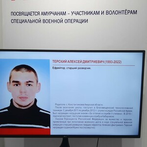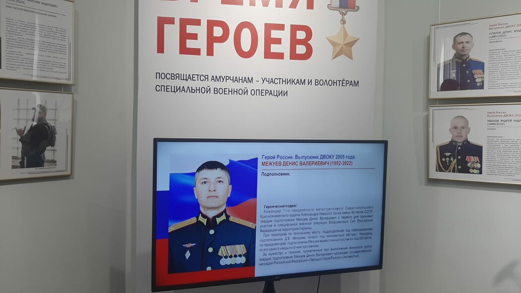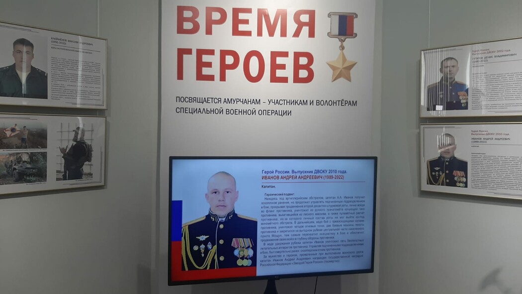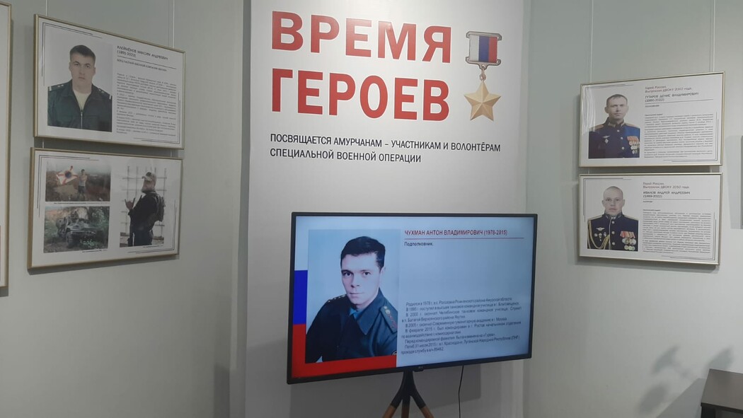 В Амурском областном краеведческом музее в преддверии 23 февраля открылась выставка, посвященная амурским бойцам – участникам спецоперации. В экспозиции, получившей название «Время Героев», представлены фотографии, документы, личные вещи, военная форма, награды, информация о боевом пути и подвигах 30-ти амурчан, погибших в ходе специальной военной операции.