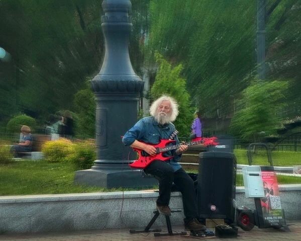 «Я сидел дома, с гитарой, подумал: "А почему бы не выйти и не поиграть?". Решил попробовать себя, это в том году еще было, со старой гитарой, акустикой. Вышел, мне понравилось, прикольно. И ходил практически каждый день. Сидел возле ротонды, но потом из-за травмы ноги забросил это. Когда решил взять себе электрогитару подумал, что мне нужно оборудование и идти играть на набережную».