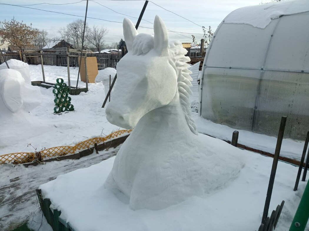 В этом году амурчан радуют богатырь, снеговик, символ года – лошадь, собака, золотая рыбка и другие фигуры.