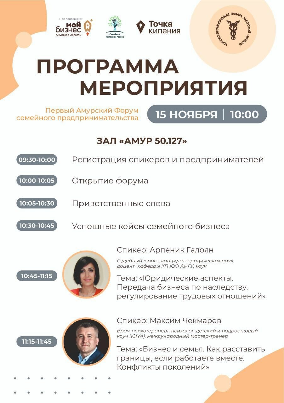 Участникам форума расскажут о правовых аспектах семейного бизнеса, поговорят о брендировании и продвижение компаний, а также уделят внимание повышению финансовой грамотности предпринимателей.