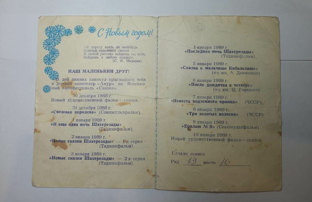 На абонементе надпись – «Наш маленький друг, в дни зимних каникул приглашаем тебя в кинотеатр "Амур" на всесоюзный кинофестиваль "Сказка"». Тогда маленькие благовещенцы могли посмотреть фильм «После дождичка в четверг», «Сказку о Мальчише-Кибальчише», выпуск «Ералаша», сказки «Шахерезады».