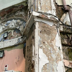 Чтобы скрыть неприглядный вид и разруху, фасад скрыли за большим баннером.