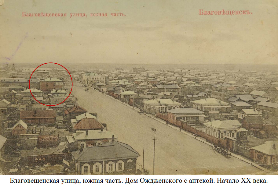 В центре Благовещенска на улице Амурской, 201, стоит еще один памятник архитектуры регионального значения – «Торговые ряды Ф.М. Ождженского», а на улице Благовещенской (теперь – Пионерской) стоял особняк с аптекой.