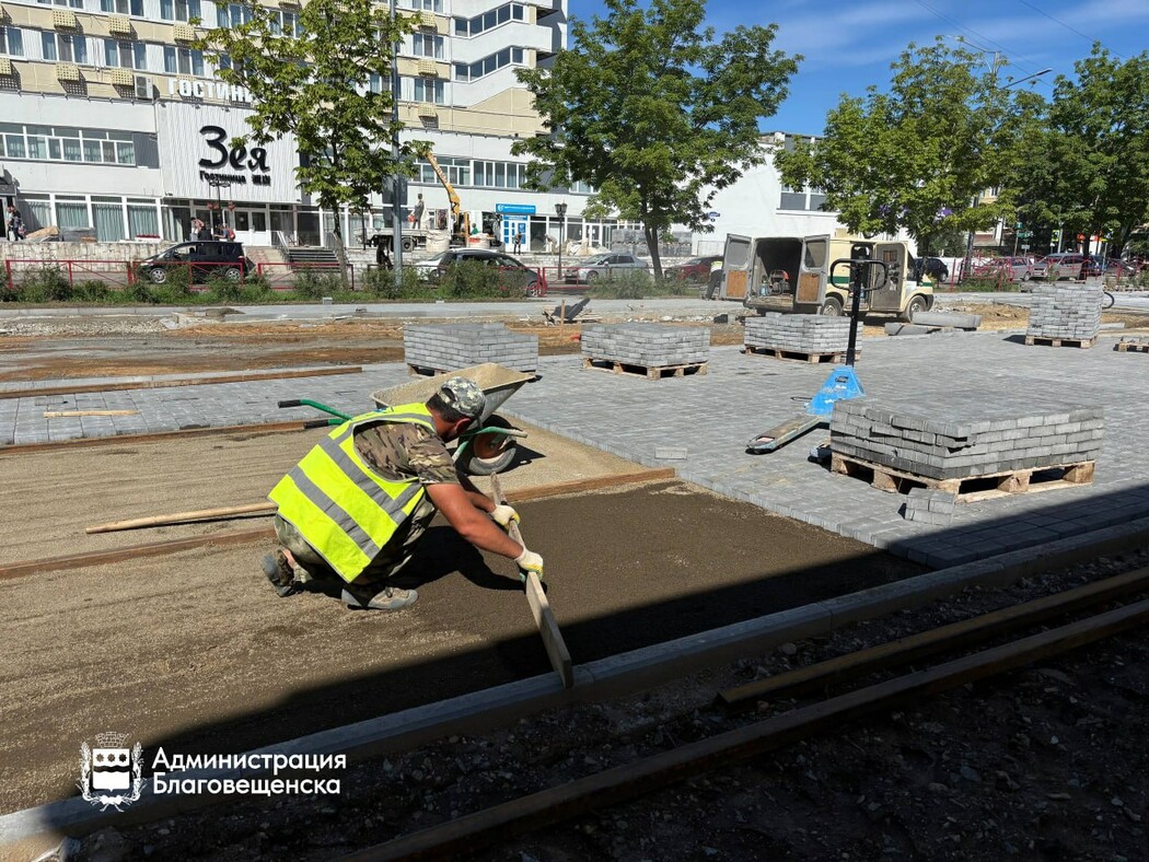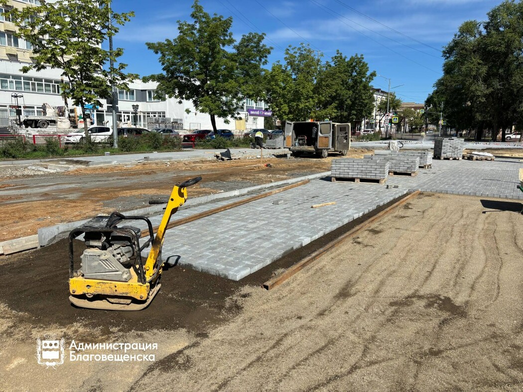Техническая готовность сквера в районе Калинина и Ленина в амурской столице составляет 60 %. На месте будущего места отдыха завершили демонтаж старых конструкций, проложили кабельные линии, подготовили основание для дорожек, а сейчас устанавливают бортовые камни и укладывают тротуарную плитку.
