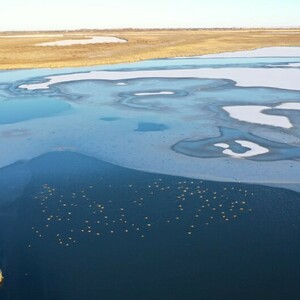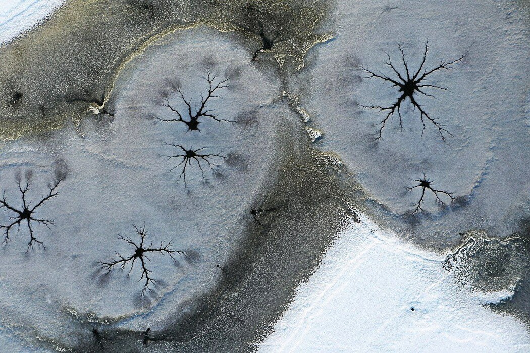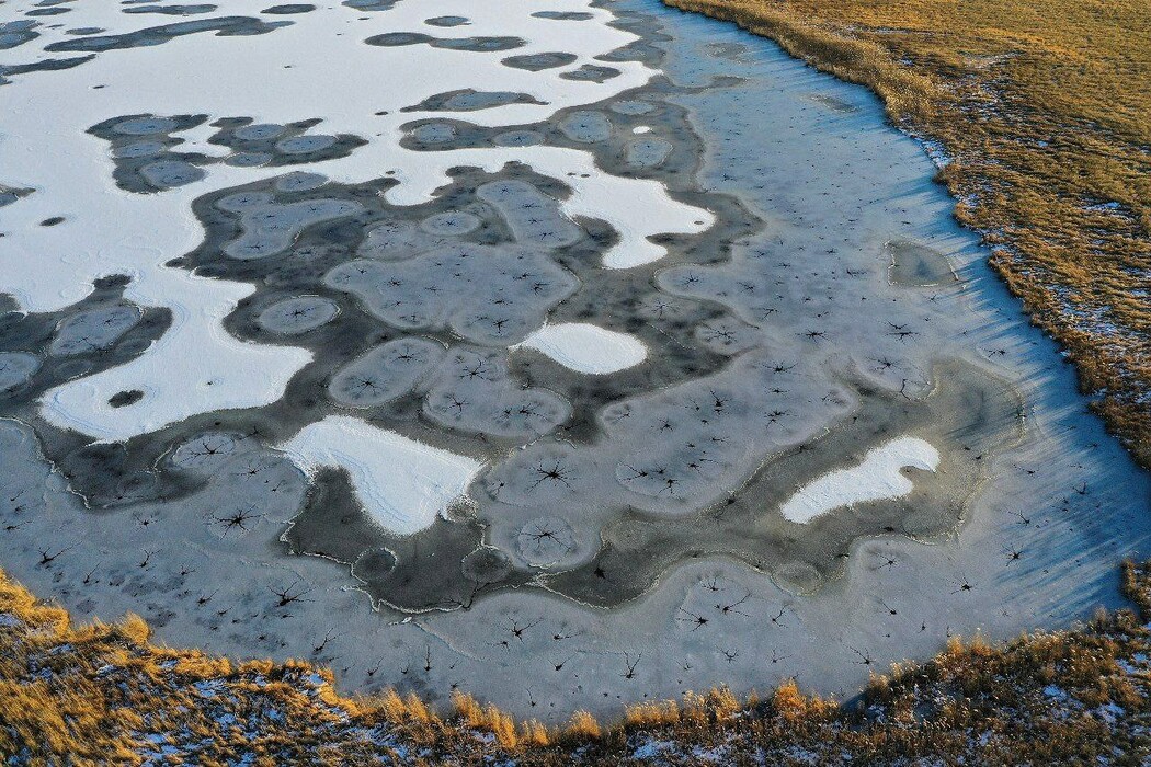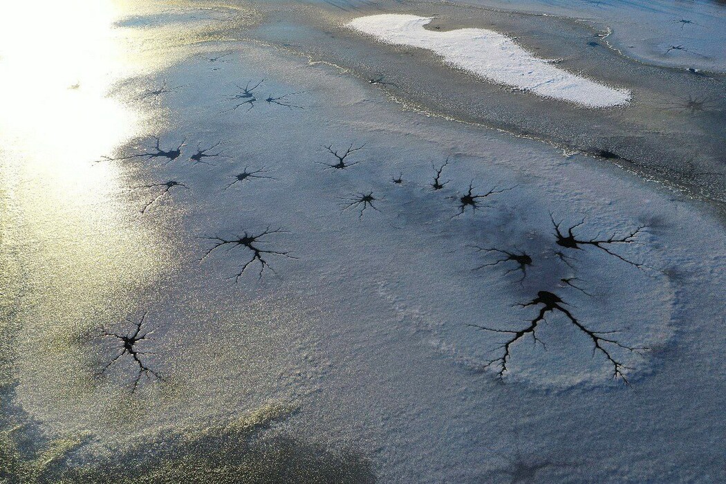 Разглядеть узоры на замерзающем озере удалось с помощью дрона, взмывшего над поверхностью.