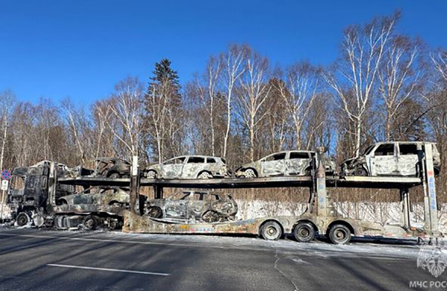 В Еврейской автономной области сгорели дорогостоящие иномарки, которые перевозили на автовозе. Ущерб исчисляется десятками миллионов рублей.
