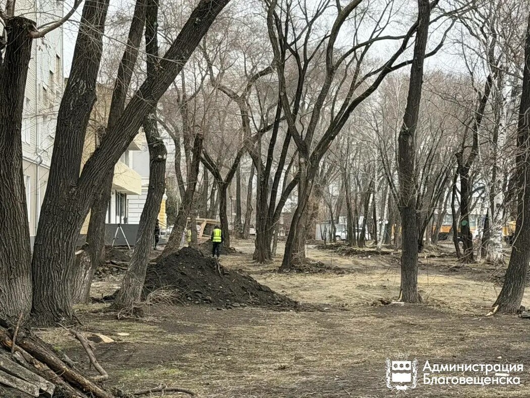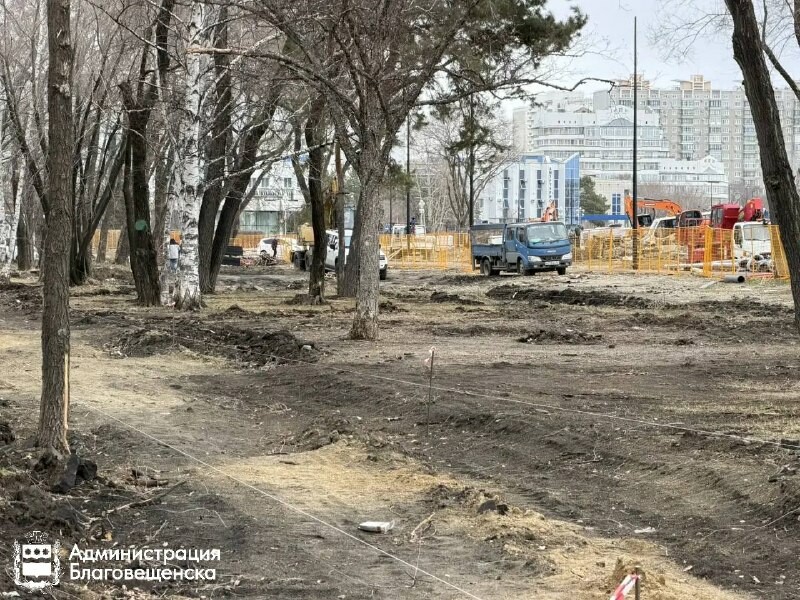 В Благовещенске приступили к благоустройству сквера за Благовещенским педуниверситетом. Подрядчик завершил демонтаж и перешёл к земляным работам: выполняет разбивку территории. После этого начнётся монтаж бортовых камней.