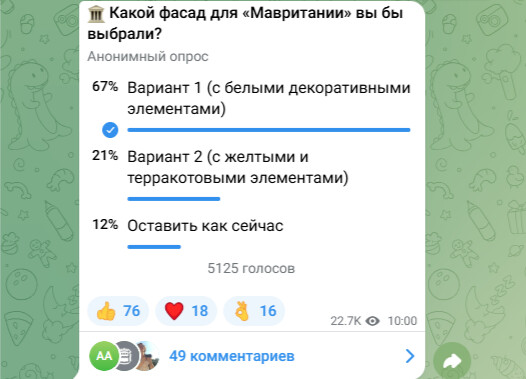 В марте прошлого года мэрия в своем Telegram-канале запустила опрос и предложила участникам выбрать один из трех вариантов, каким они хотели бы видеть «Мавританию»: с белыми декоративными элементами, к которому привыкли благовещенцы; желтыми и терракотовыми элементами; красный кирпич без окрашенных элементов. Мнения пользователей разделились.